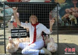 女子把自己關(guān)在籠中 抗議快餐店虐殺動(dòng)物