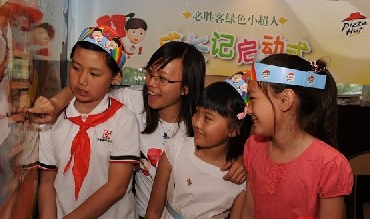 京城首家“必勝客綠色小超人主題餐廳”近日正式揭幕。大學(xué)生志愿者們帶領(lǐng)來(lái)自呼家樓小學(xué)的首批“必勝客綠色小超人”在這里開始了一場(chǎng)“畫手絹游戲”。
