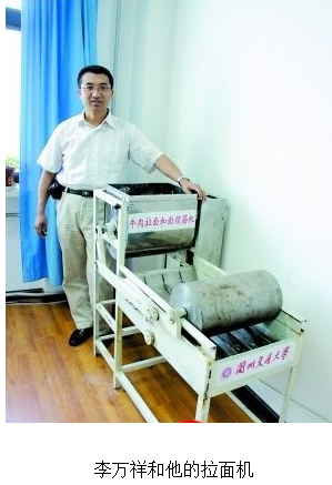 這種拉面機(jī)長1.8米,高1.5米,寬80厘米,一般拉面店都能放得下。1.5千瓦的拉面機(jī)20分鐘就能完成50斤面的全部和面、揉面、甩面、順筋、拉面工序。在李萬祥的辦公室,記者看到,從機(jī)器出口處倒入水和面粉,出口處便可得到成型的面棒,甚至面條。如果用人工,一個人需8小時才能完成這些工序。“不過我現(xiàn)在并不想直接生產(chǎn)出來拉面的面條,主要怕老百姓一時接受不了。”