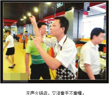火鍋店的寇經理介紹,聾啞服務員很會觀察別人講話的口型,如果客人說得慢、口型夸張點,他們就能知道客人需要什么服務。每張火鍋桌都配有專用的便簽紙,如果存在溝通問題,雙方還可以通過書寫進行交流。