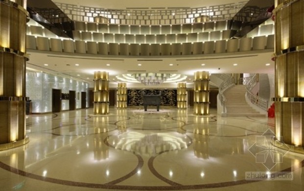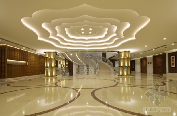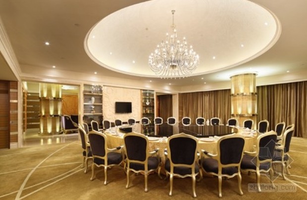 設計師摒棄了傳統高檔餐廳的金碧輝煌,在大廳的設計中將“牡丹”、“祥云”、“浮萍”、“瓦片”等元素運用其中,寄托了對東方文化的無限情感。“牡丹”主要表現在頂面造型之中,在恢弘的空間中增添了優雅的氣質,烘托清雅閑逸的情境。“祥云”躍然于畫面之上,散發著無限曼妙的意境,富有煙云溟?的意趣,配合地面水波蕩漾的圖案,蜿蜓又悠然自得的神態表現的淋淋盡致,豐富了視覺效果,讓人不禁幻想是徜徉在一望無際的大海之中。中庭的設計將柱子與梁的結構大膽的運用和處理,使空間多了份莊嚴與質樸。傳統房屋中“瓦片”元素的運用更加貼近自然。