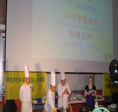 當天下午,為迎接訪問團的到來,校方特別組織了名為《舌尖上的中國》主題課程,兩百多位學生被中國美食所吸引主動報名參與課程。訪問團成員,來自于中國廚師之鄉順德的羅福南、林潮帶、連庚明、馬澄根等幾位大師首次在美國孔子學院的講堂上進行了精彩的演講課程和技藝展示,大師們的精湛技藝征服全場,現場不時地爆發出熱烈掌聲,菜肴的美味令學生們垂涎不止,紛紛跑上臺與大師們互動交流,同時也迫不及待的要品嘗美味。