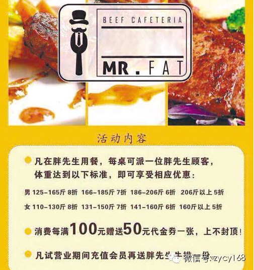 每桌可派一位胖先生顧客,體重達到以上標準,即可享受相應優惠。