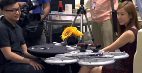 利用無人操控飛行器科技概念,Infinium Robotics公司研發出“自助無人操控飛行托盤”,服務生只要預先輸入桌號后,把食物放在托盤上,托盤就會自動飛行到客人附近。