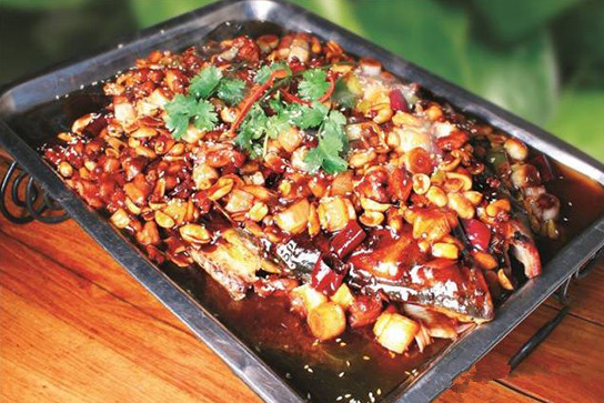 5、凈鍋下一半碗汁熬開、攪濃,起鍋淋到烤魚周圍。6、鍋下底油燒熱,加入干辣椒段15克炸至棕紅色,再放入花椒8克炸香,隨后下蔥丁30克、姜丁8克煸香,倒入雞丁翻炒均勻,烹入剩余的料汁快速翻裹均勻,撒入油酥花生米200克翻勻,調(diào)少許油辣椒起鍋蓋到烤魚上,點火上桌即成。