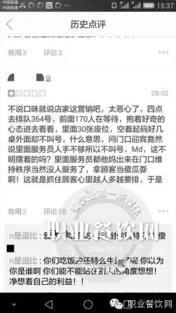 而讓宋女士意想不到的是,一次由感而發的差評卻換來了言語攻擊。記者在大眾點評網上看到,一位名叫“n是逗比”的網友接連給宋女士留了兩次言,其中一次留的是“你們吃飯的還XX牛X了呢!你以為你是誰啊?你們能不能站在別人的角度想想!凈想著自己的利益”,另一次則是“愛XX吃不吃,有能耐你別XX來,傻X”!
