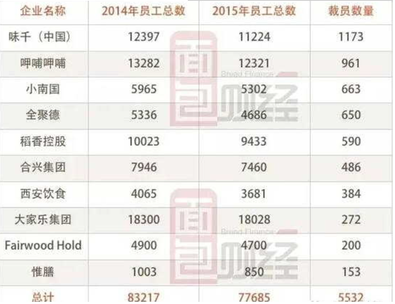 面包財(cái)經(jīng)翻查了港股與A股餐飲類上市公司財(cái)報(bào)發(fā)現(xiàn),大部分餐飲公司在2015年均采取了較為明顯的裁員措施。下圖為面包財(cái)經(jīng)整理的在A股和港股上市餐飲企業(yè)員工數(shù)變化圖:上述10家餐飲企業(yè)裁員人數(shù)為5532人,裁員率為6%;其中味千員工數(shù)量減少最多,較上年減少1173名;全聚德員工減少比例則高達(dá)12%。