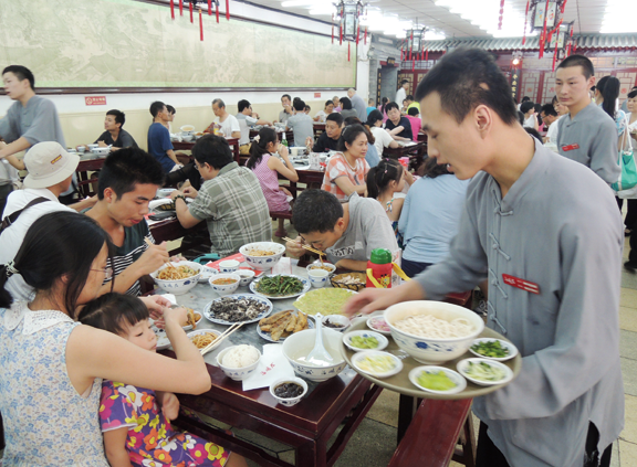 “來了,您哪,幾位,里邊請”、“小二,倒茶”這樣的高喊聲從人們一進(jìn)門就伴隨在耳邊,讓人一下子沉浸在老北京的市井文化中,隨之而來的便是穿對襟衣衫,蹬圓口黑布鞋、戴瓜皮帽、肩搭手巾把兒的小伙計(jì),帶著顧客來到大理石的八仙桌前,落座在紅漆實(shí)木的長條凳上。觀賞著一幅長約16米的畫作《清明上河圖》,聆聽著京韻大鼓,不知道還以為自己在排古裝戲!吃好喝好后,又會(huì)在門童和小二“送客、走好、您哪”的喊聲中愉快地離開。不過,與韻味十足的老北京氛圍不同的、能讓人回到現(xiàn)實(shí)的,是前臺(tái)的電腦軟件結(jié)賬系統(tǒng)和寬敞明亮的就餐大廳,向人們傳遞著現(xiàn)代科技與生活流行色交織在一起的飲食時(shí)尚。