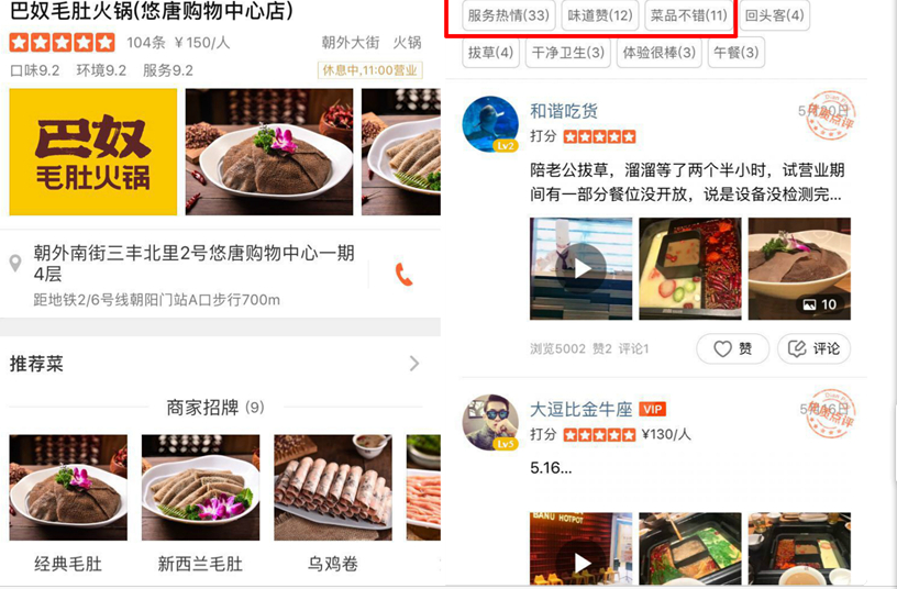 一周后,記者再次來到北京店就餐,店內餐位已經全部開放,仍然供不應求。據巴奴門店負責人透露,巴奴北京店定位為毛肚專家旗艦店。試營業(yè)當天賣了100多桌,此后幾天的數據都有增加。而從顧客的綜合評價來考核,截至發(fā)稿,巴奴北京店在大眾點評上已得到五星好評。97條評價中,好評89條,中評6條,差評2條。好評所夸贊的地方主要在服務、菜品、店面風格、鍋底等方面,其中超過30位顧客點了“服務好”這個標簽,而中評和差評指出的問題在價格偏貴(記者實測,人均消費150左右)、餐位預定等方面。