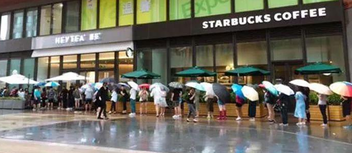 ▲ 購買喜茶的隊(duì)伍從星巴克門口經(jīng)過