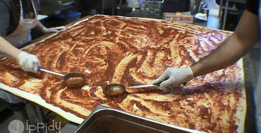 Big Mama‘s&Papa’s的助理經理阿信•格雷戈里(Oshin Gregory)詳細解釋了巨型披薩的制作過程:廚師將七塊傳統大小的面團堆疊在一起,鋪開后加入沙司,然后放入烤箱中烤兩分鐘取出,再加入奶酪和配料,最后將披薩切成小塊準備送貨。